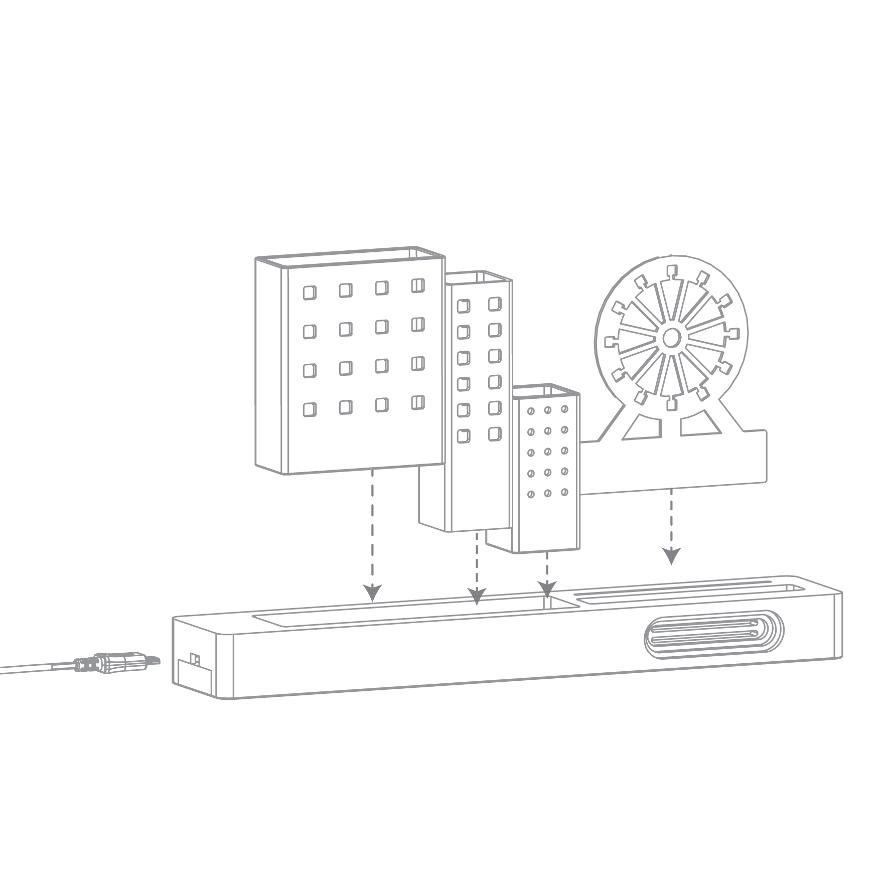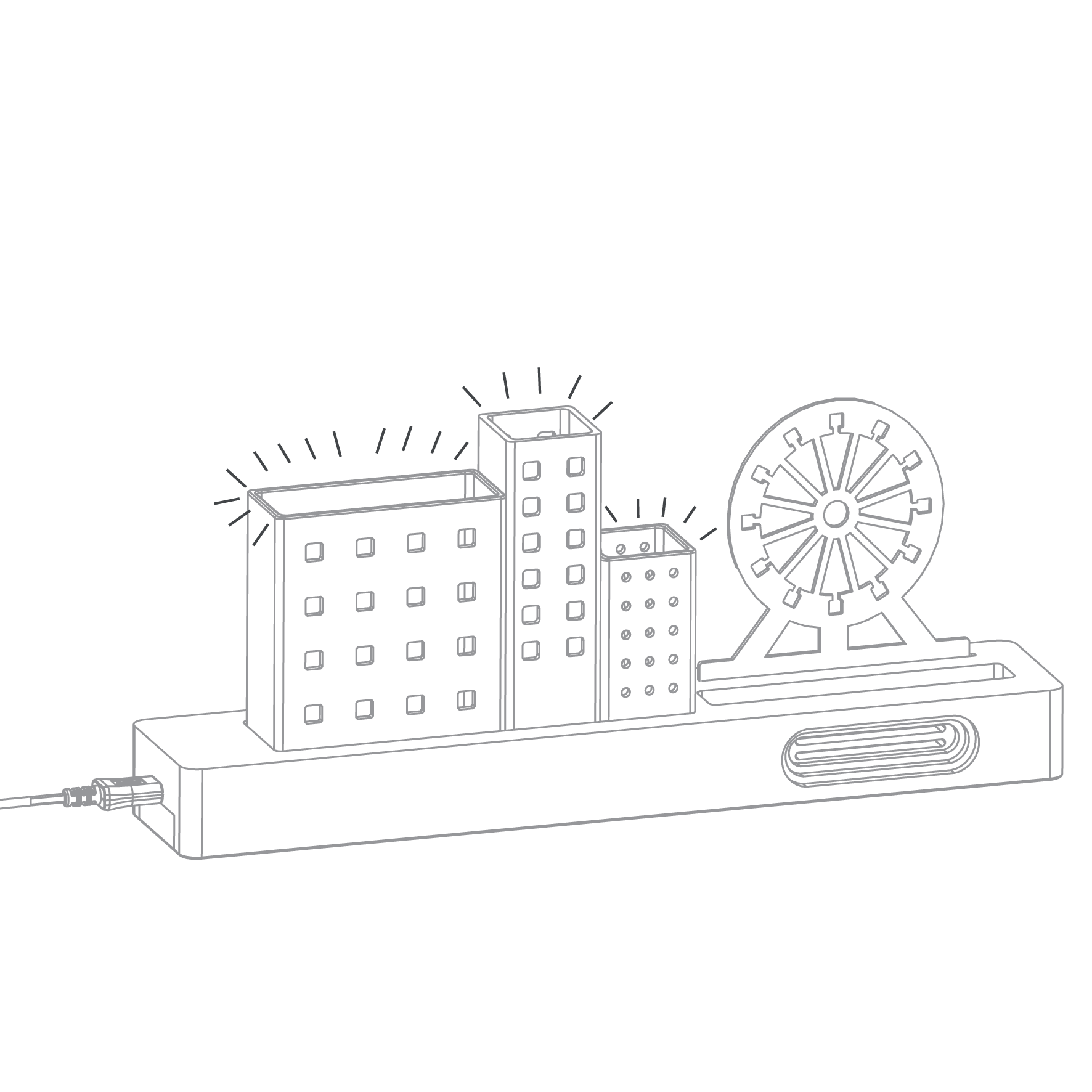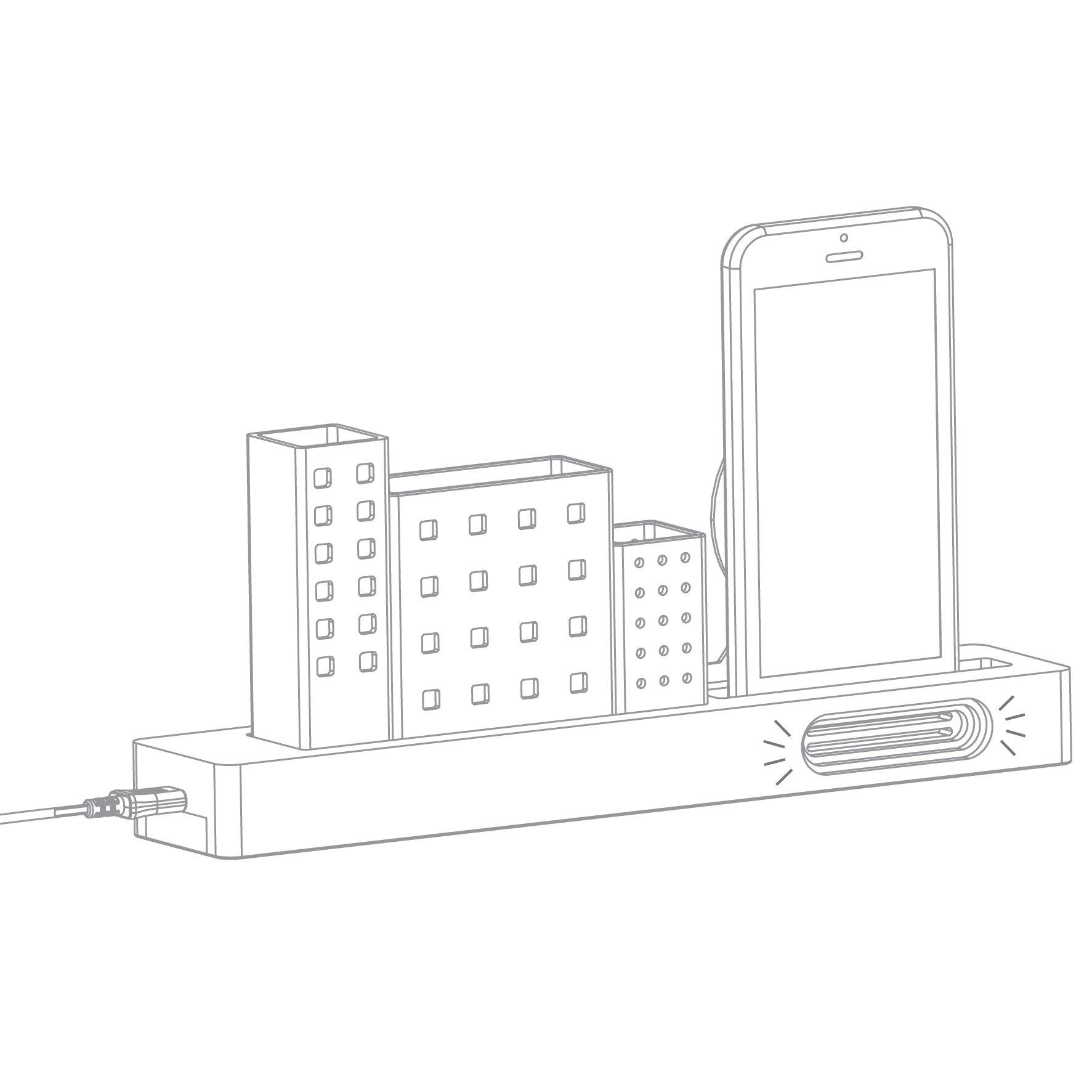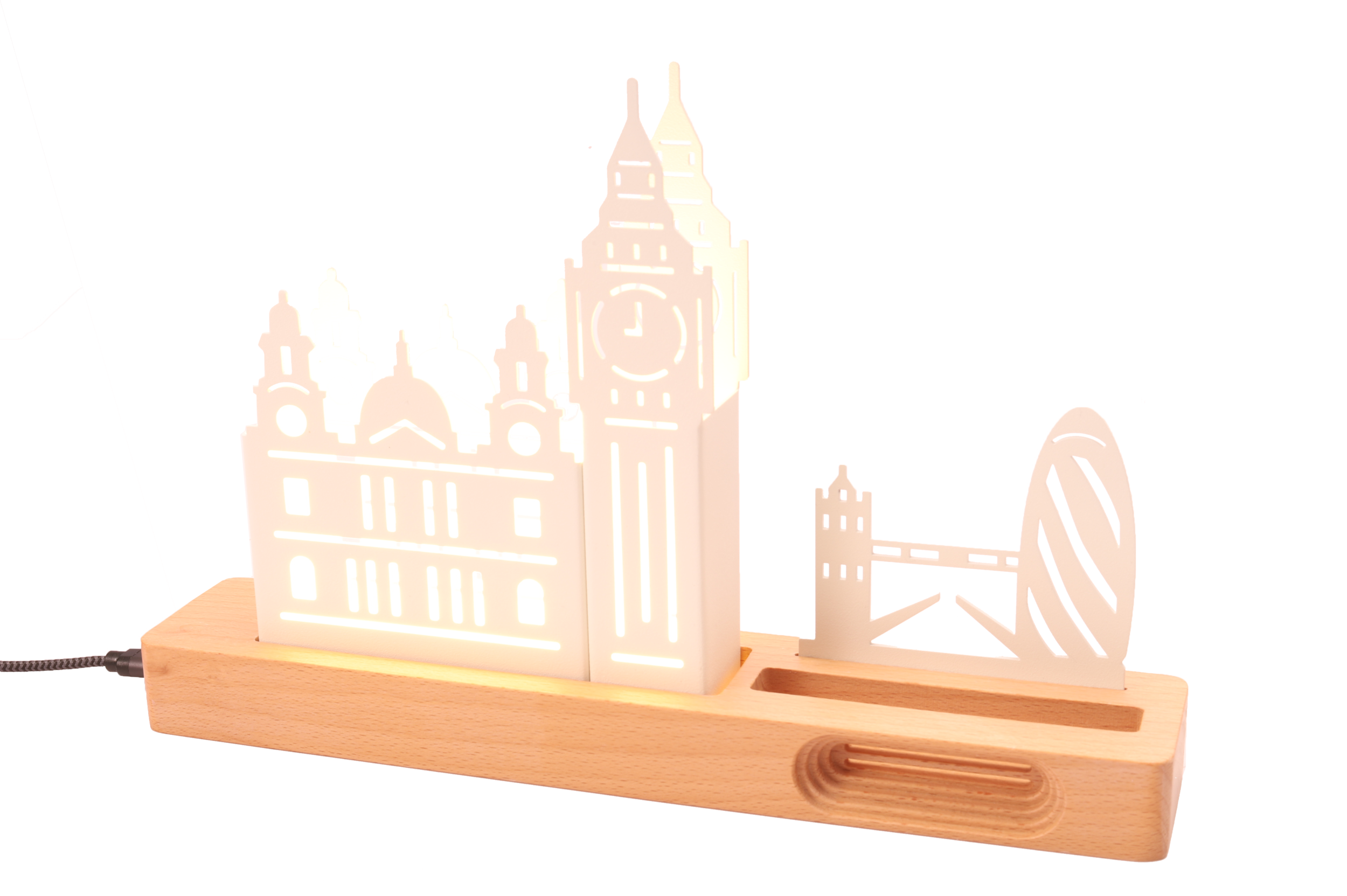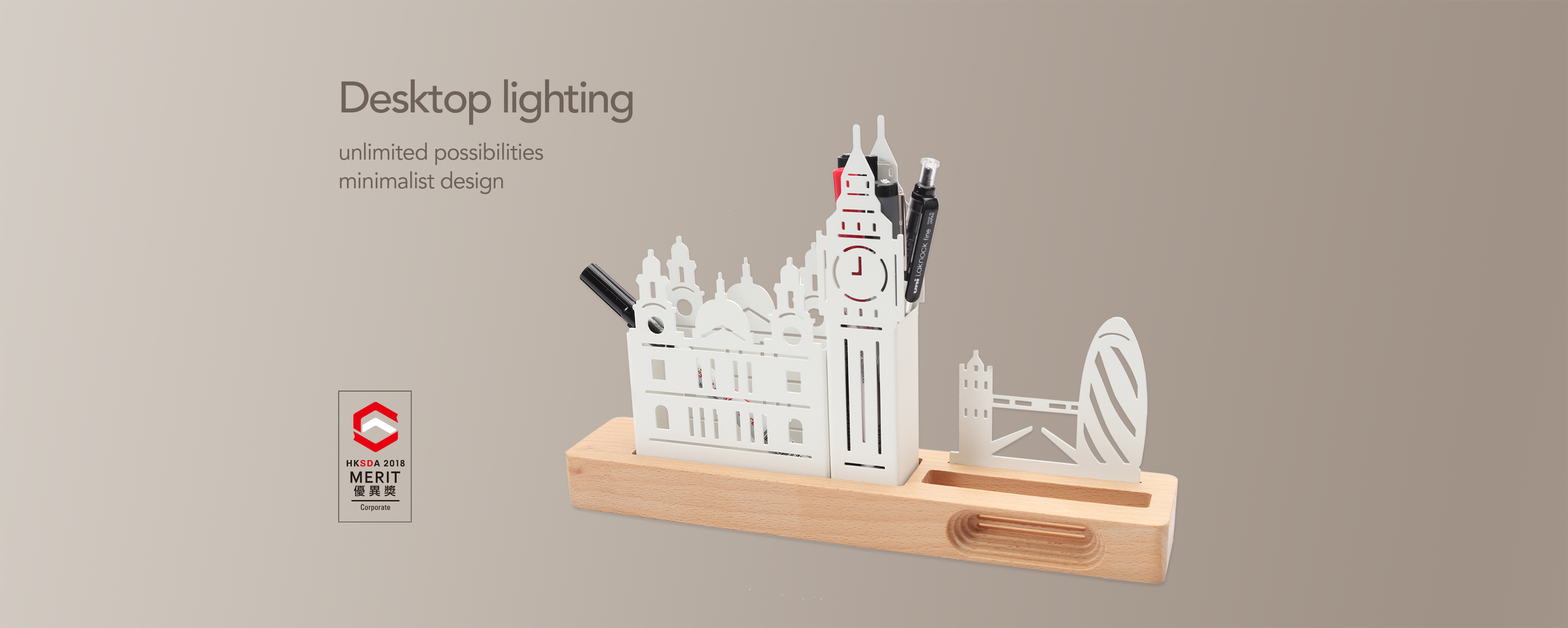 INsight’s Desktop lightings reappear distinctive buildings in different cities by using minimal lines. The material of the buildings is carbon steel. The building lines and the details are emitted by the soft warm LED lighting. The wooden base also has a phone stand and natural amplifier functions, which allows users to put their phone on it; and listen to music and relax during busy workdays. Users can also create a unique exclusive small city by building their own different blocks combination according to their preferences, which is elegance and simplicity.